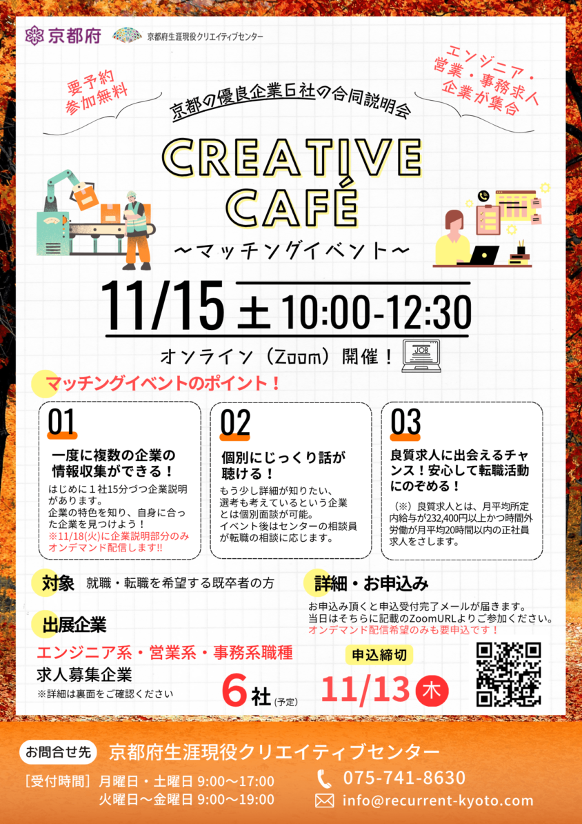 申込方法:京都お仕事マッチング診断「ジョブこねっと」にて申込を受け付けております。