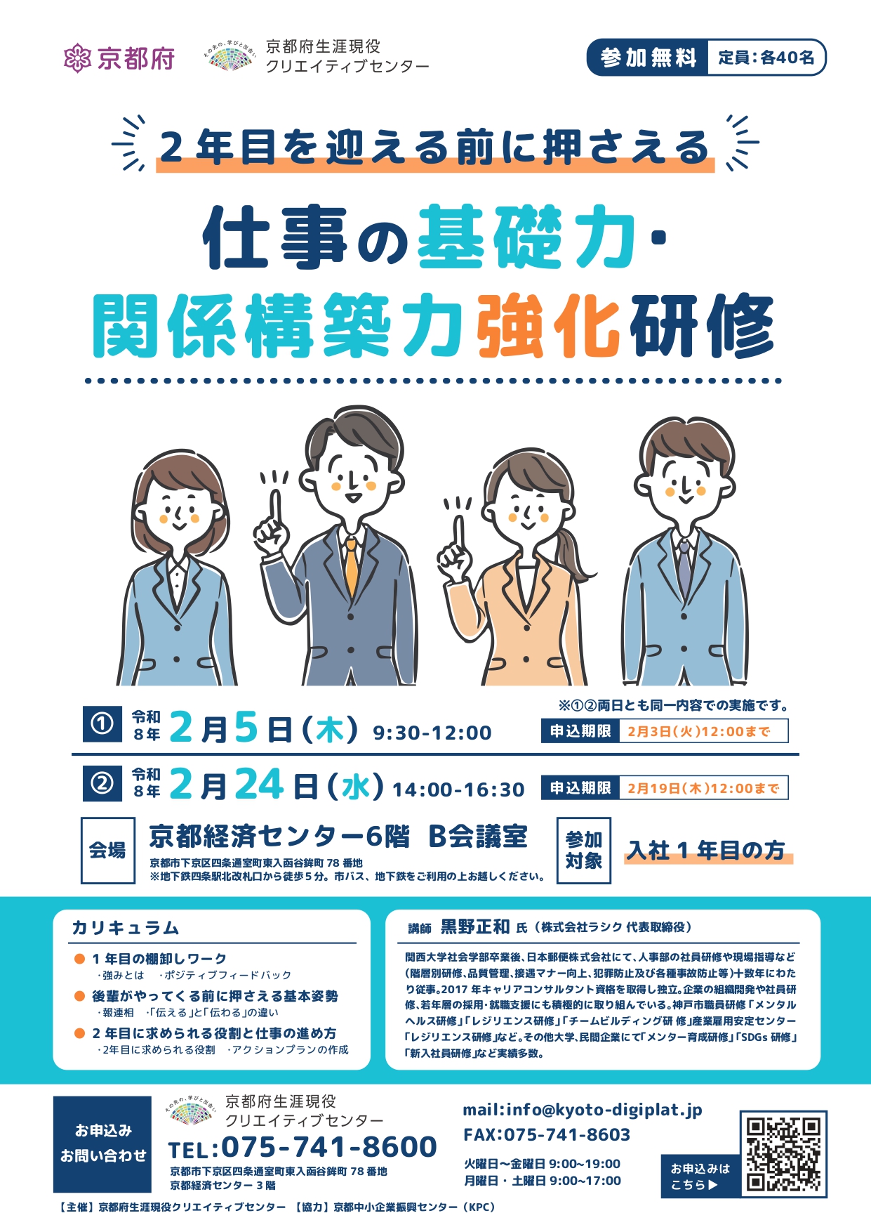 京都府生涯現役クリエイティブセンターでは、入社1年目のみなさまが「2年目の壁」を乗り越え、安心して成長を実感できるよう、下記の通り研修を開催いたします。